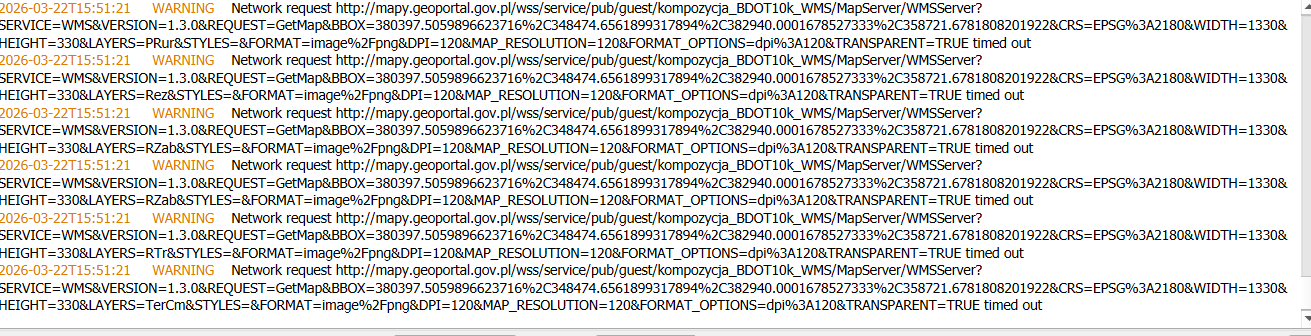 Zatem trochę słabą formę mają usługi geoportalowe obecnie. Zgłosiłbym się tam https://www.geoportal.gov.pl/pl/pomoc/zglos-blad/ w pierwszej kolejności, choćby po to, by ich ponformować.