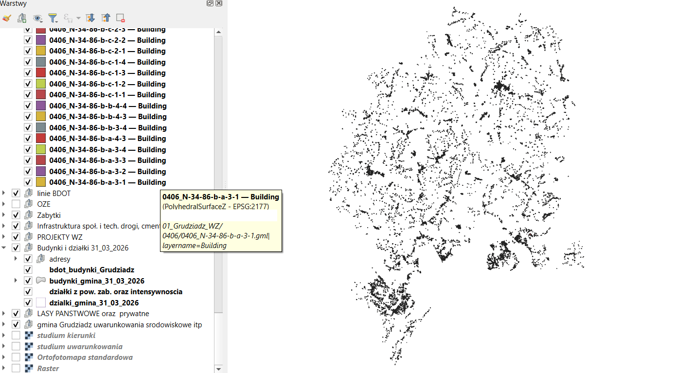 Pobrałem modele budynków 3D Geoportalu (Modele mają atrybut przybliżonej wysokości). Niestety nie mogę dopasować współrzędnych tej warstwy do warstwy projektu. Tak nie wyglądają granicę powiatu grudziądzkiego. Pobrane budynki mają jakieś odbicie lustrzane/obrót/przesunięcie.