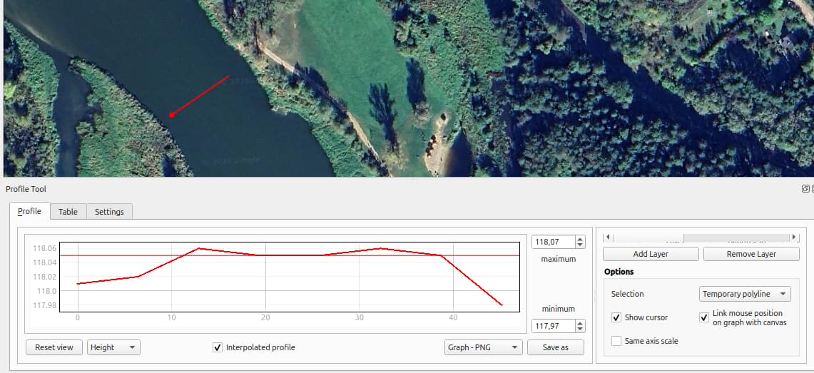 Jak jest wyznaczany NMT z GUGiK nad wodą tego “na pewno” nie wiem, w sumie ciekawe pytanie. Zakładam, że jakoś interpolują wysokość na podstawie brzegów i wybranych punktów LiDAR nad wodą, które jednak - z jakichś powodów - uznali za pomocne/wiarogodne. Czemu tak sadzę? Bo gdyby to była tylko interpolacja pomiędzy brzegami, to by nie było takich różnic na osi Z przekroju (tu Bug na wysokości Mielnika) poprzecznym: