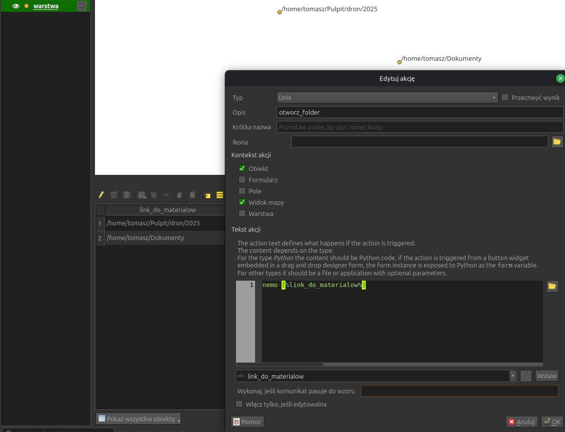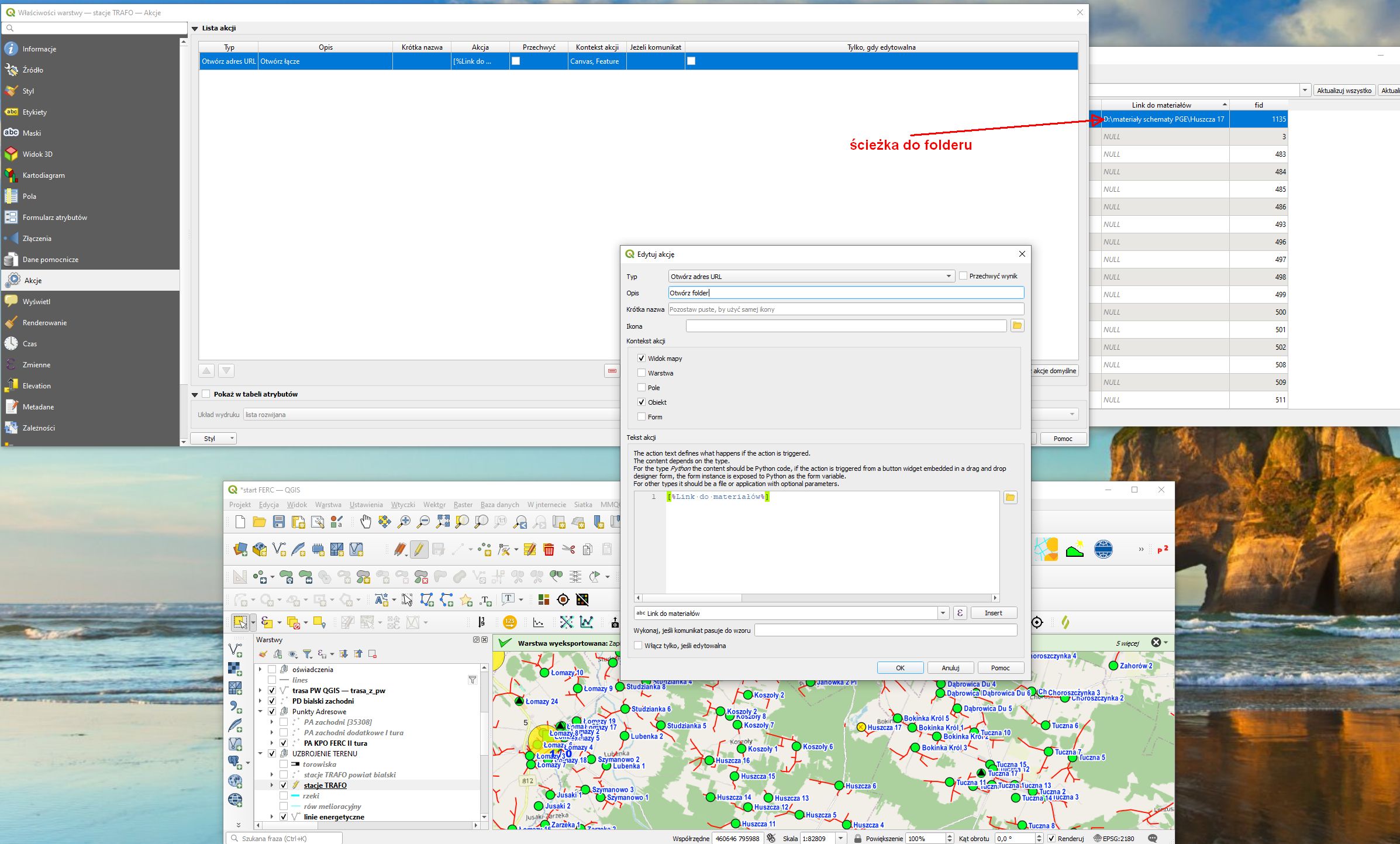 W tabeli mam utworzony atrybut “Link do materiałów” z wpisaną ścieżką do lokalizacji tego folderu. Chciałem utworzyć akcję jak w załączeniu, ale to nic nie daje. Efekt jaki chciałem uzyskać to po kliknięciu w dany punkt (Stację) np. z przyciskiem CTRL otwiera się folder z