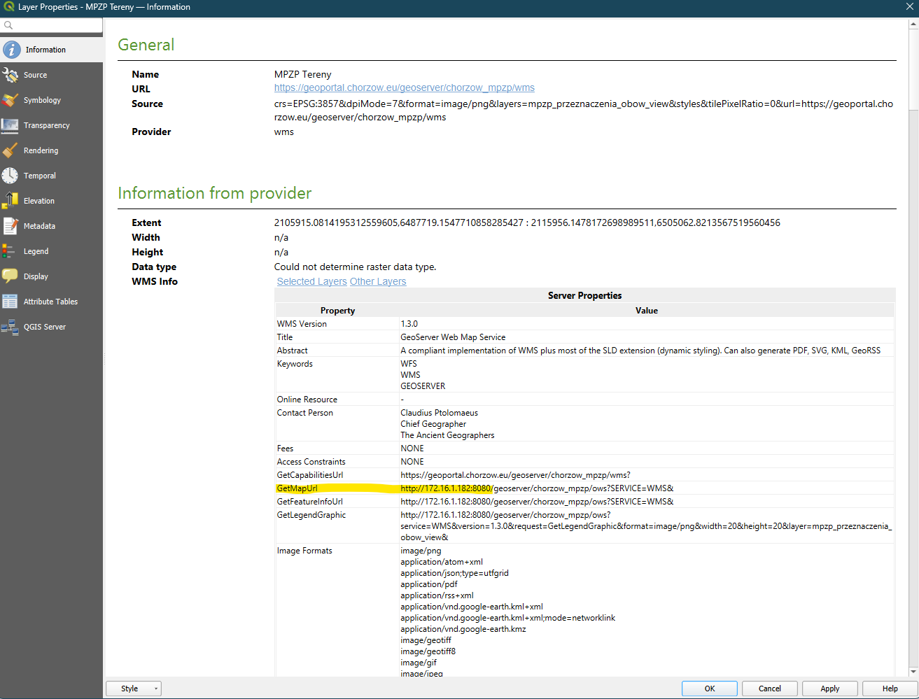Super Tomek, o to chodziło. Nawet, jak się zorientowałem o co chodzi pisząc moją odpowiedź wyżej, że ten serwer zgłasza się ładnie pod https://geoportal.chorzow.eu/geoserver/chorzow_mpzp/wms?service=WMS&request=GetCapabilities, ale kieruje GetMap do http://172.16.1.182:8080/geoserver/chorzow_mpzp/ows?SERVICE=WMS to zacząłem rozkmniać, czy może da się oszukać QGIS jakoś ściągając to GetFeatureInfo do np. txt, podmieniając adresy, i wtedy wymusić wykorzystanie przez QGIS tego txt zamiast url do przypisania właściwych adresów.