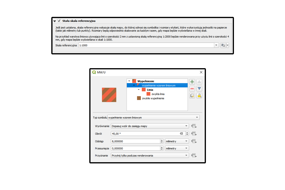 Drugi problem dotyczy renderowanie się wypełnienia linią poligonu. Ponownie renderowanie warstwy ustawiłem na 1:1000. Jednak sposób wyświetlania wypełnienia wraz z przybliżaniem i oddalaniem zmienia się. Czy istnieje metoda, aby zablokować wyświetlanie warstw, tak aby faktycznie cały czas była wyświetlana tak jak dla skali 1:1000?